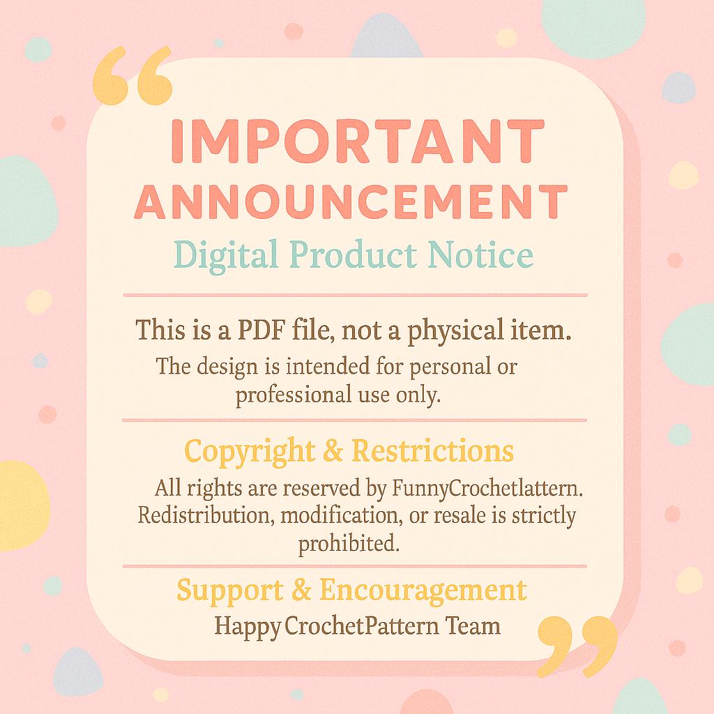 All patterns and designs are the intellectual property of FunnyCrochetPattern. You may sell finished products made from this pattern, but redistribution or reselling of the pattern itself is strictly prohibited.
